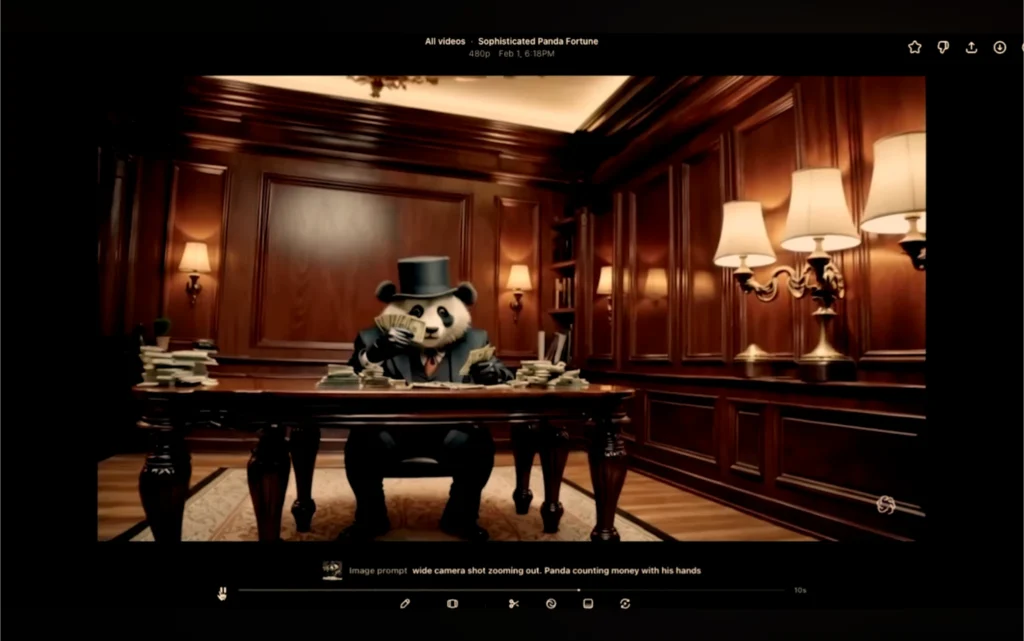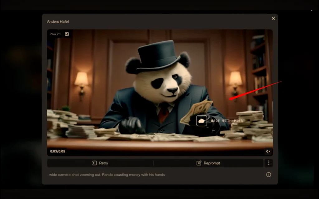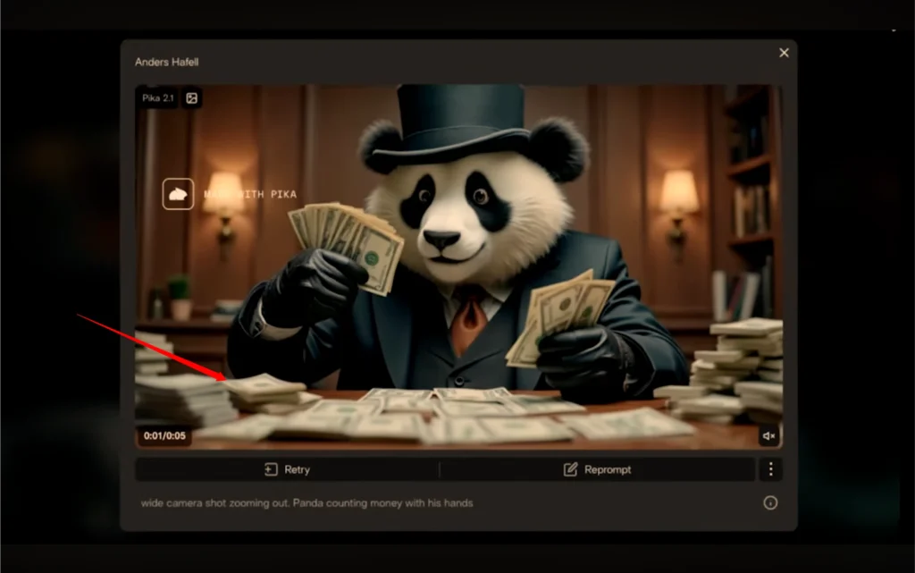 The first Pika generation showed a wide camera shot zooming out. The panda was counting money with his hands.