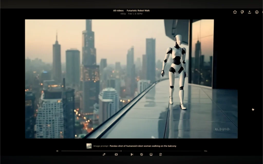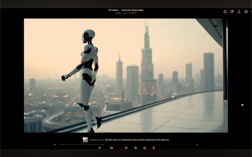 This was a parallax-style shot of a humanoid robot woman walking on a balcony.